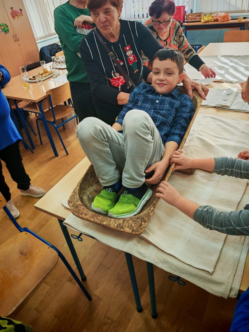 Susret je započeo prigodnim programom koji su učenici marljivo pripremali od početka školske godine. Izmjenjivale su se pjesme, recitacije i scenske igre koje su gosti pratili s ponosom i ganućem i svaki nastup nagrađivali snažnim pljeskom. Slijedilo je čitanje svima poznate narodne priče „Djed i repa” koju su uz učiteljicu izvodili svi gosti. Nakon razgovora učenici su uz pomoć svojih gostiju izrađivali ilustraciju priče. Veliki interes pobudilo je natjecanje u kojem se u obliku kviza tražilo poznavanje kajkavskih riječi te njihovo sparivanje s odgovarajućim riječima standardnog književnog jezika. Peglanje u koritu željeli su isprobati svi učenici, a bake i djedovi su im rado pokazali kako se to nekad radilo.