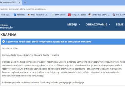U sklopu obilježavanja 9. Dana medijske pismenosti (20. – 26. travnja 2026.), učenici 6. razreda sudjelovali su u radionici „Sigurno na mreži: lažni profili i odgovorno ponašanje na društvenim mrežama”.