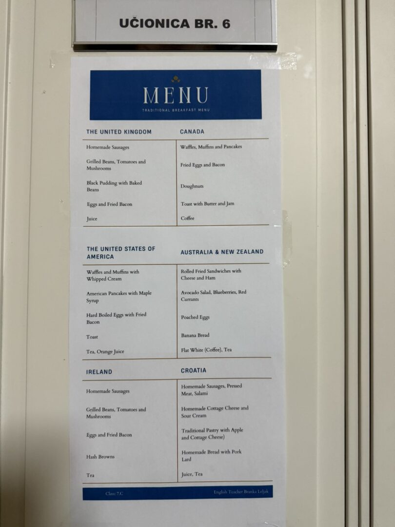 Učenici su bili podijeljeni u šest skupina. Pet skupina predstavljalo je po jednu državu engleskog govornog područja (Veliku Britaniju, Irsku, Sjedinjene Američke Države, Kanadu, Australiju/Novi Zeland). Šesta skupina predstavljala je našu domovinu, Hrvatsku. Kod kuće su pripremali tradicionalne doručke svojih zemalja i ponosno ih poslužili u učionici. Na njihovim su se stolovima našli engleski tost s marmeladom, američke palačinke, kanadski sirup, jaja s prženom slaninom, australski sendič od avokada, ali i krvavice, razne kobasice, zapečeni grah, kruh s masti, jabučni i sirni štrukli te još puno ukusne hrane.
